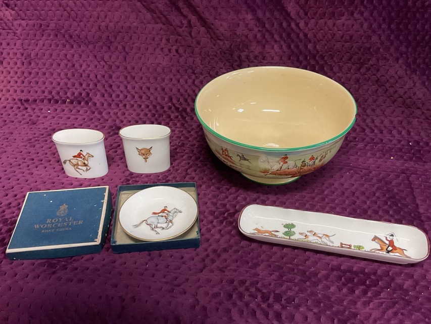 Fox hunting ceramics - a pair of Royal Worcester cigarette holders and matching boxed pin dish decorated with huntsmen and fox heads; a Crown Staffordshire pen tray; and a Royal Doulton Fox-Hunting pattern bowl. (5)