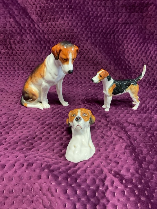 A 1935 Royal Worcester handpainted figure of a seated foxhound - 6.5in; a Royal Worcester fox head wall mask - 4in; and a Royal Doulton standing foxhound model HN1027 - 4in. (3)