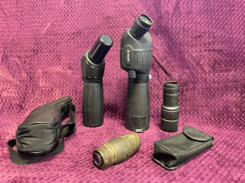 A cased Oregon Compact 12-36 x 50/45 monocular spotter scope; another 20-60 x 60 by Zennox; a Bushnell 16 x 52 pocket telescope; and a military monocular snipers spotter scope reputedly used in the Gulf war. (4)