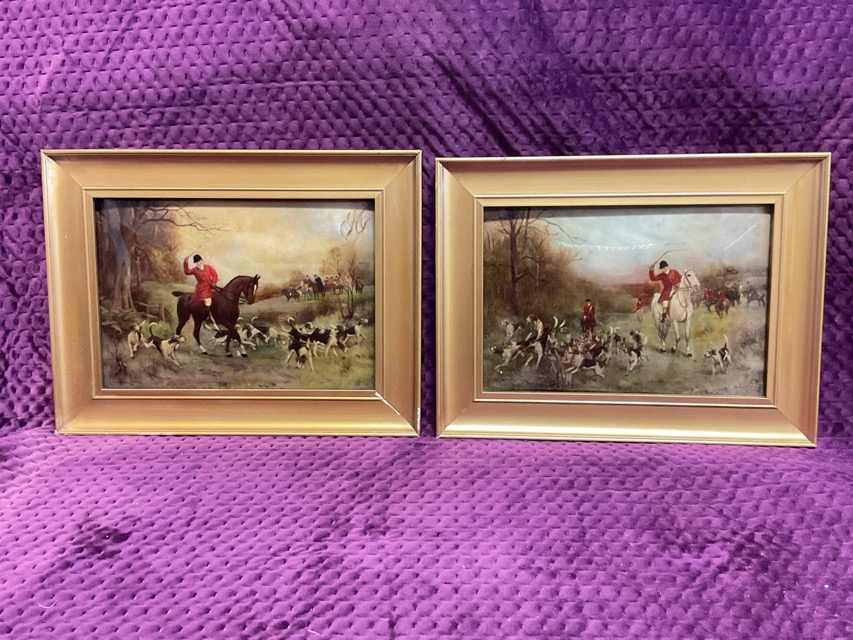 A pair of Edwardian coloured crystoleums depicting foxhunting scenes with mounted huntsmen, hounds and whippers-in, gilt framed. (9.5in x 6.5in) (2)