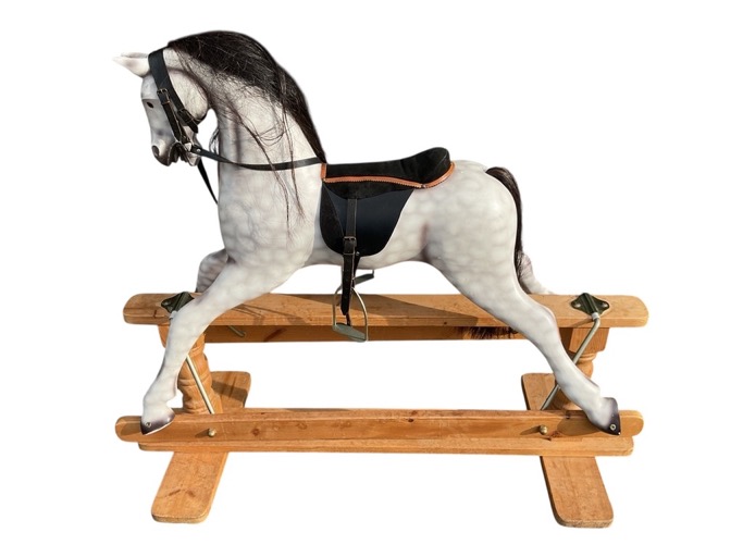 A contemporary childs rocking horse with painted dappled coat, leather saddle, horsehair mane & tail, etc., mounted on rectangular pine stand with turned columns. (52.75in)
