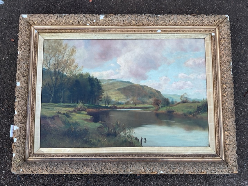 F Buchanan, Edwardian oil on canvas, river landscape, signed and inscribed to verso An April Day in the Vale of Conway North Wales 1903, in foliate scrolled gilt & gesso frame. (35.5in x 23.5in)