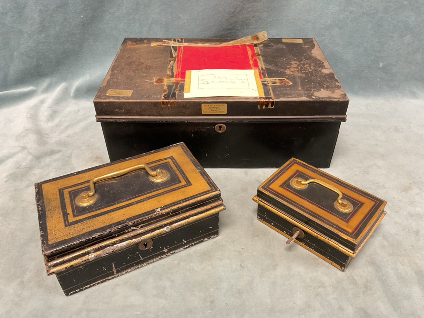 A tin deed box with brass lock; and two old metal money boxes with brass handles - one with compartmentalised interior. (3)
