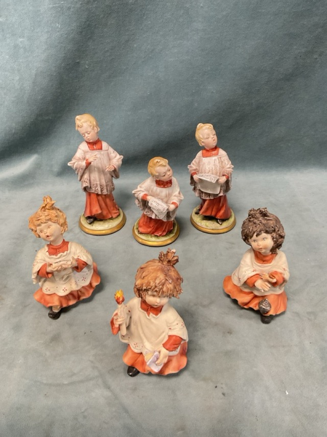A set of three Merlin porcelain characterful choirboys on circular gilt bases; and a Capo di Monte set of three similar choirgirls. (6)
