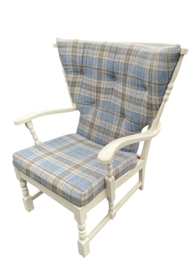 A painted spindleback armchair, the tapering back with button upholstered tweed cushion above conforming seat, framed by shaped arms on turned supports.