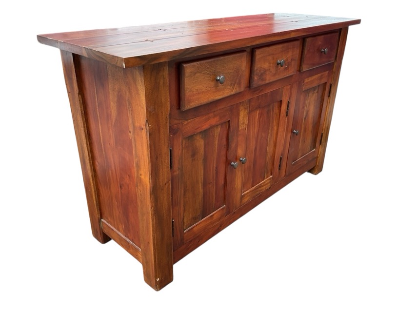 A hardwood dresser with rectangular grooved top above three frieze drawers and panelled cupboards - all mounted with knobs, raised on square chamfered column legs. (59.25in x 19.75in x 35.5in)