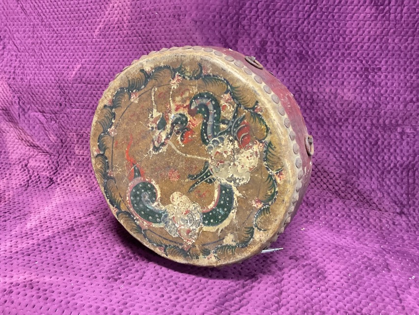 An antique Chinese Bangu drum with red lacquered body, iron suspension loops and studded skins handpainted with a dragon and a phoenix within flowering vine borders. (16in x 16in x 7.5in)