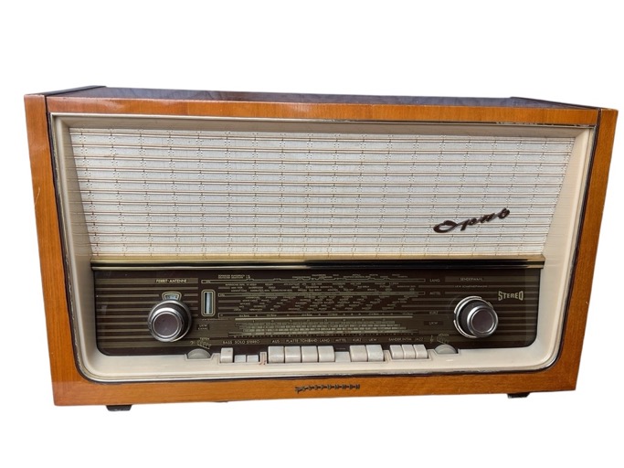 A 1960s Telefunken Opus stereo valve radio in walnut case having glass dial, fabric speaker cover, gilt trim, etc. (26.75in)