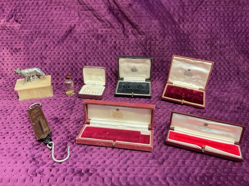 An alabaster Italian box surmounted by a Capitoline wolf; a vial of 24k gold leaf flakes suspended in spirit; a box of loose Noriko baroque pearls; a Salters brass pocket balance; and four gilt tooled leather jewellery cases by Garrard, Mappin & Webb, and Asprey. (8)