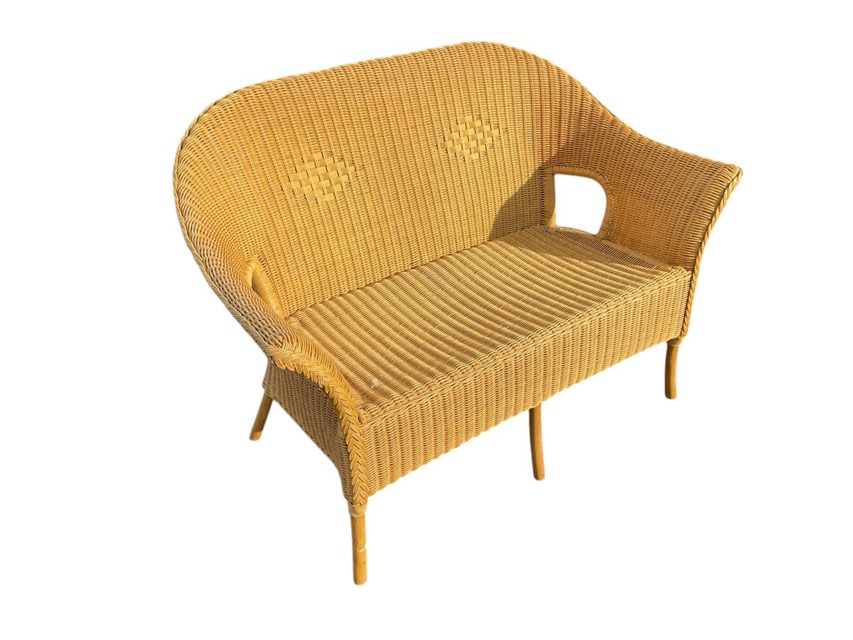 A cane sofa with rounded arched back and outswept arms raised on turned legs, the back woven with two diamond shaped lozenge panels. (48in)