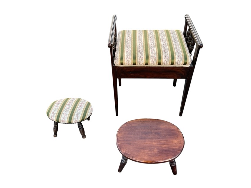 A stained Edwardian piano stool with moulded arms on gallery spindles framing upholstered box seat; an oval Victorian footstool with brass studding on turned legs; and another oval stool on turned legs & stretchers. (3)