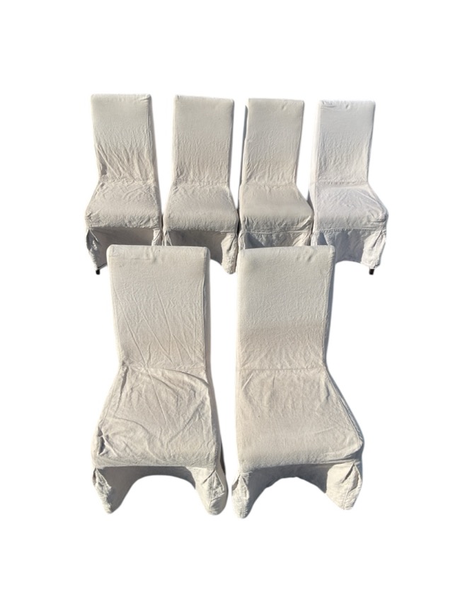 A set of six contemporary dining chairs on square tapering ebonised legs with linen loose lace-back covers. (6)