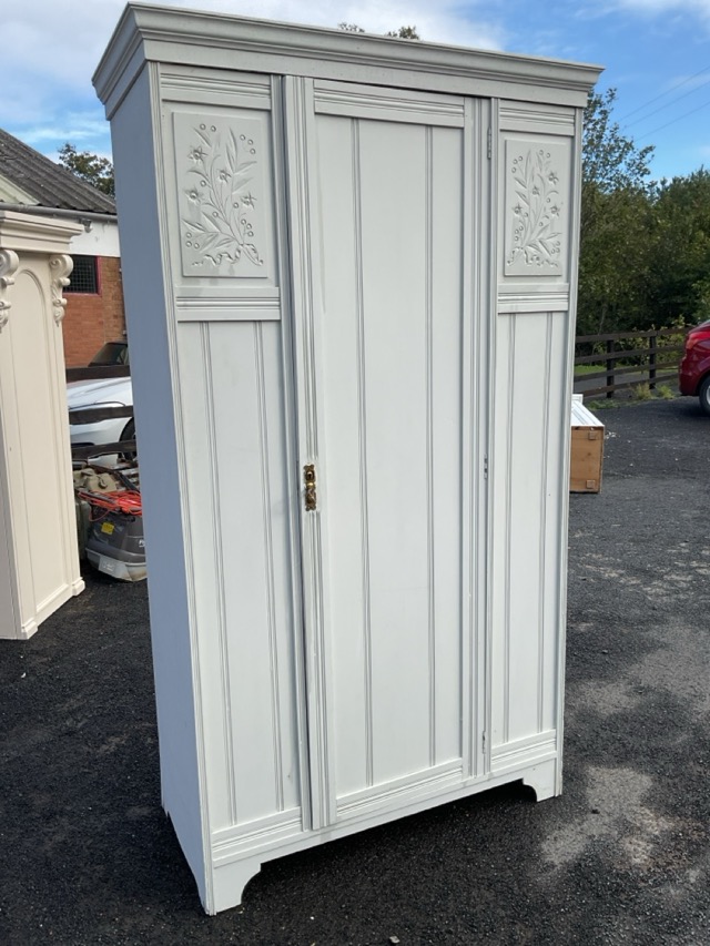 A late Victorian painted wardrobe with moulded cornice above rib moulded panels and door enclosing hanging space, the side panels with floral ribbon carvings. (42in x 19.75in x 78.5in)