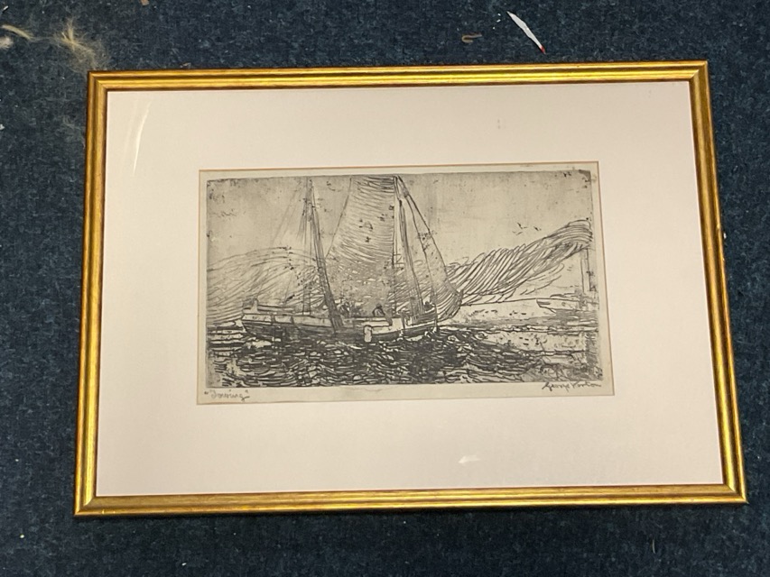 George Horton, aquatint, a fishing vessel under tow by a steam tug, titled Towing, signed in pencil on margin, mounted and gilt framed. (11.5in x 6.5in)