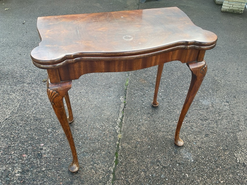 A Edwardian walnut Georgian style card table by H Shaw of London, with serpentine fold-over top enclosing baize compartment containing cards and score pads, raised on shell carved cabriole legs. (30in x 36in x 28.25)