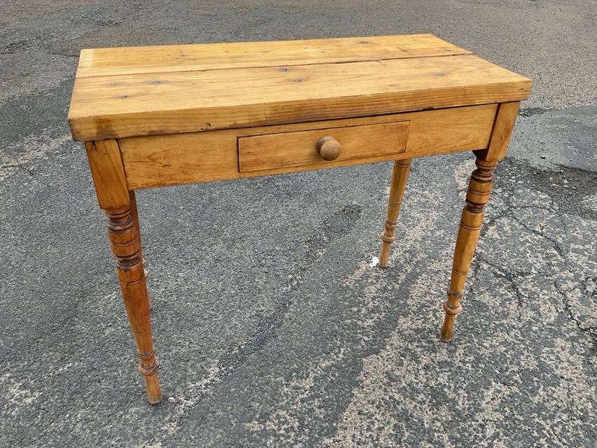 A Victorian pine side table with thick rectangular top above an apron with knobbed frieze drawer, raised on turned tapering legs. (35.25inx 17in x 30in)