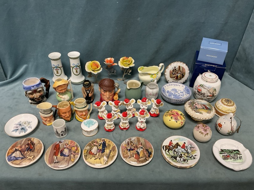 Miscellaneous ceramics - boxed Doulton & Wedgwood, character jugs, a set of four Cries of London pot lids, a pair of European porcelain vases, a Christmas mouse band, a set of Schweppes willow pattern dishes, etc. (A lot)