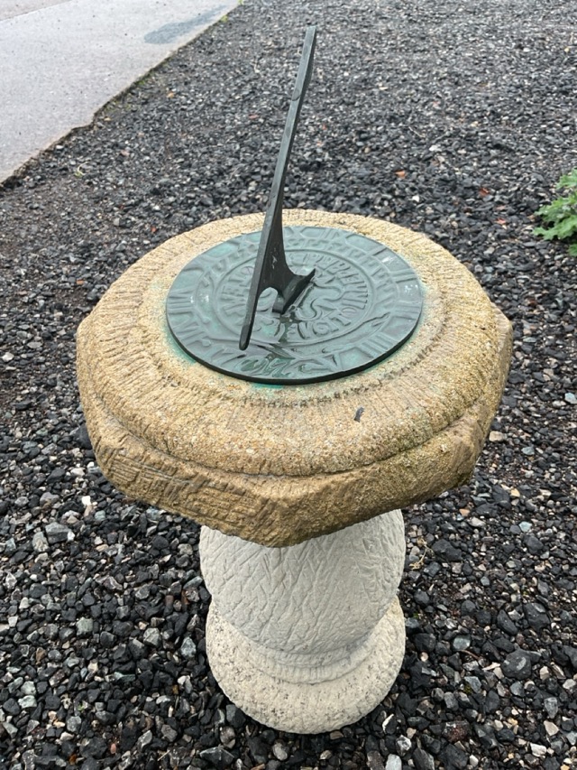 A composition stone garden sundial with circular cast bronze panel and angled gnomon on an octagonal platform, supported on a baluster shaped column and moulded plinth. (24.5in)