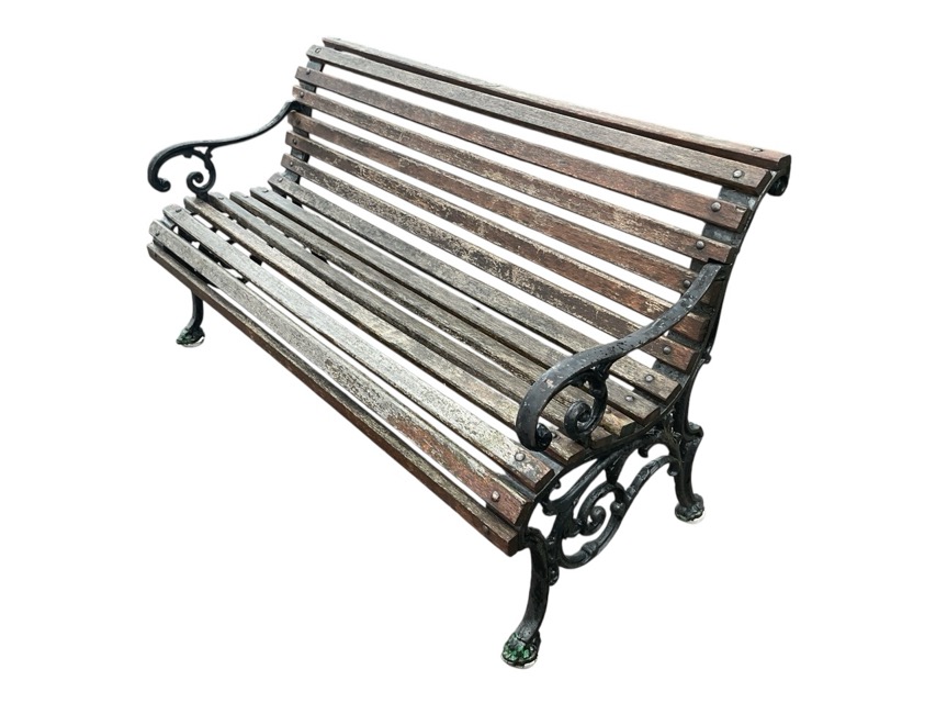 A Victorian cast iron garden bench with teak slatted back and seat on scrolled supports with paw feet - made at Ironbridge Gorge. (57in)