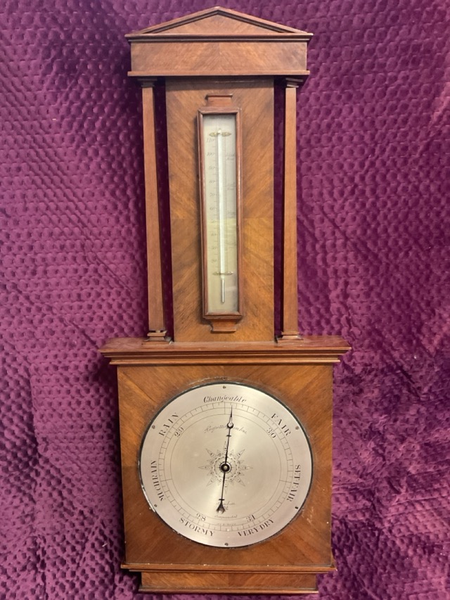 A C20th deco style Negretti & Zambra barometer with architectural style mahogany body, having thermometer flanked by square tapering columns. (28.5in)
