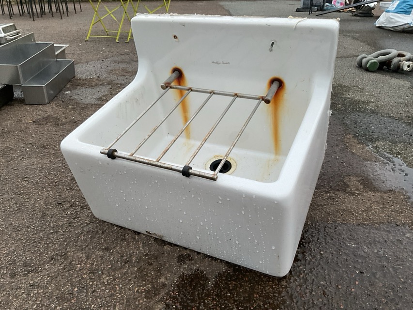 A rectangular Armitage Shanks butlers sink with hinged chromed draining tray to back above a basin. (20in x 15in x 15in)