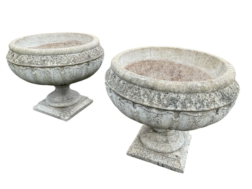 A pair of bulbous composition stone urns with tubular cushion rims above leaf moulded bodies on socles with square plinths. (21.5in x 18in) (2)