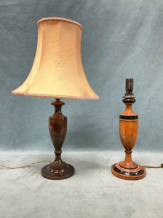 A stained turned beech urn form tablelamp with scalloped silk shade - 21in; and a turned maple and part ebonised tablelamp - 14in. (2)