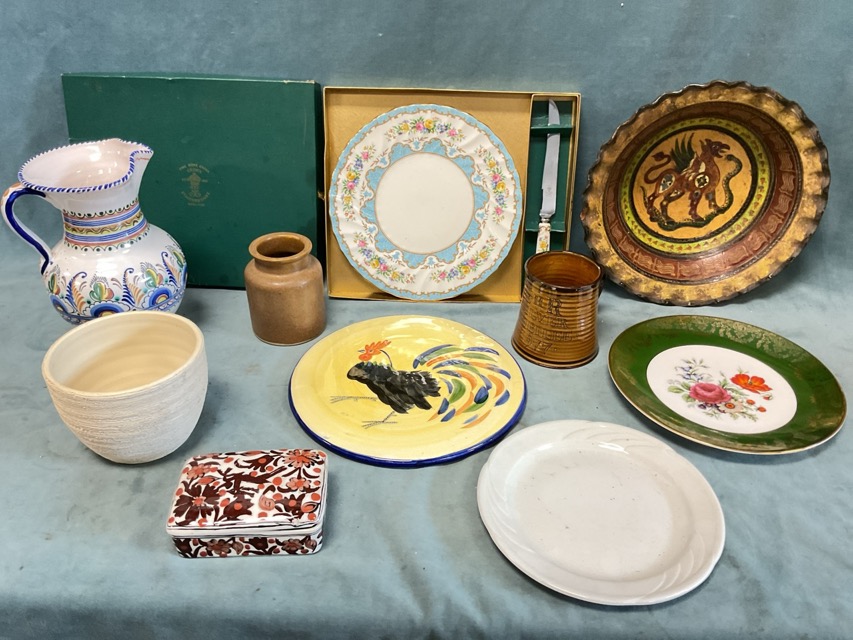 Miscellaneous ceramics - an Italian scraffito decorated dragon & snake bowl with waved rim, a boxed Crown Staffordshire floral plate & knife, a Greek cigarette box, studio pottery, a Portuguese handpainted jug, etc. (A lot)