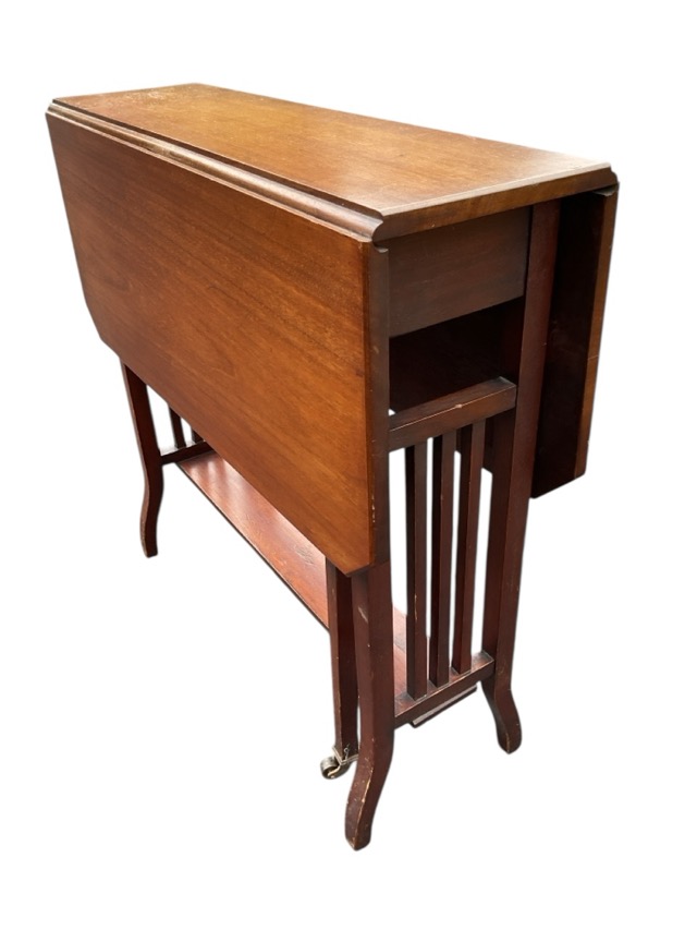 An Edwardian mahogany sutherland table with canted top having drop-leaves on gate legs with brass pot castors, the ends with square spindles above splayed legs. (9.5in x 26in x 27in closed)