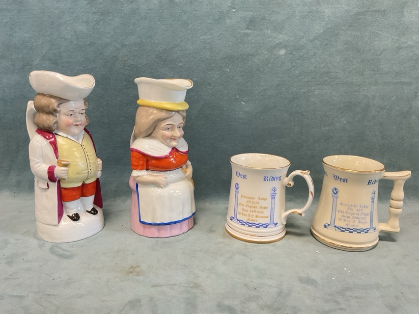 A pair of C19th Carl Thieme Potschappel porcelain toby jugs in the form of a Victorian gentleman and a female cook; and two commemorative masonic beer mugs. (4)