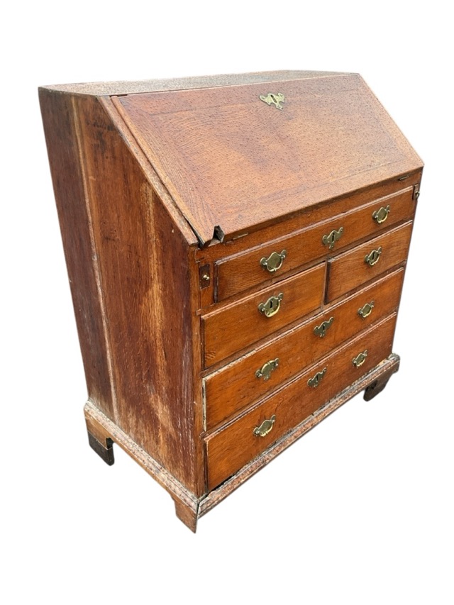A George III oak bureau having panelled fallfront enclosing a fitted interior with drawers, pigeonholes and cupboard, the desk with five drawers raised on bracket feet. (34in x 18.5in x 37.75in)