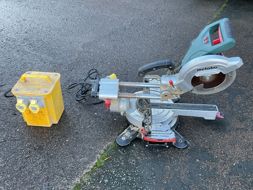 A Metabo circular saw on mitre block turntable stand, complete with power source transformer. (2)