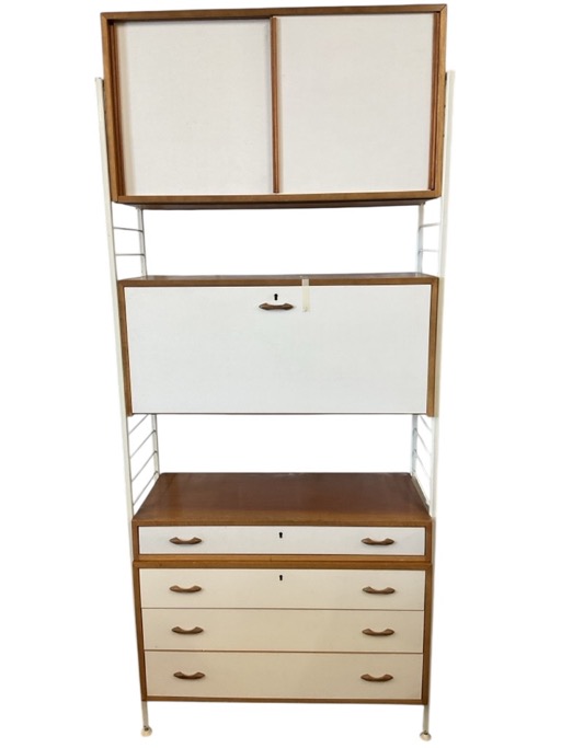 A 1970s Ladder-rack unit with sliding door cupboard above secretaire with drop-down compartment, and four long drawers, raised on ladder side supports. (37in x 14.25in x 86in)