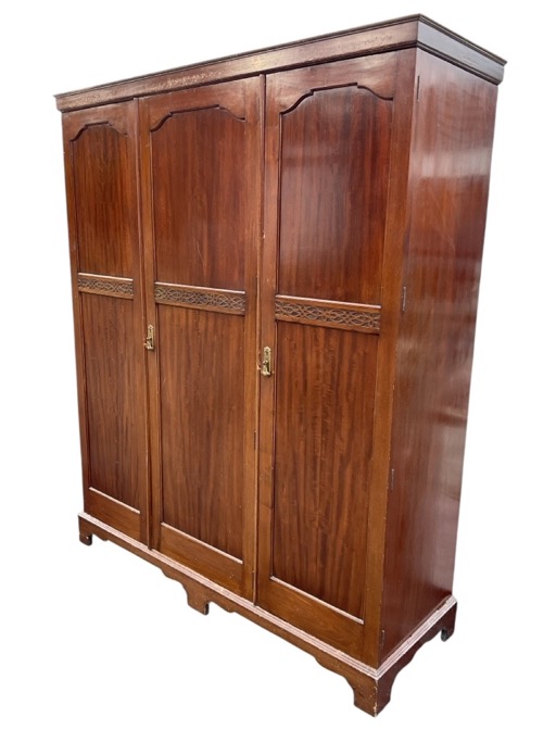 An Edwardian mahogany wardrobe with three doors enclosing a fitted interior with hanging space, shelves and compartments, the panelled doors decorated with blind fretwork band, raised on bracket feet. (59in x 19.75in x 72.5in)