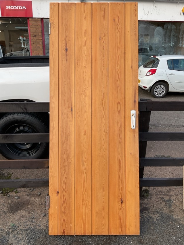 A 70s internal door of pine plank construction with with mortice lock & handle. (30in x 78in)