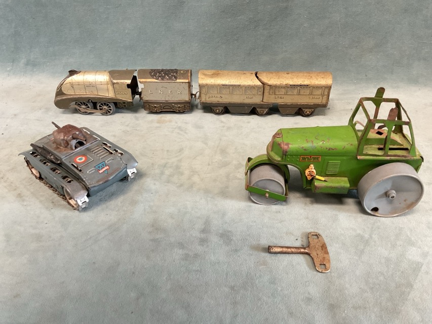 A 30s Hornby LNER Silver Link streamlined locomotive, tender and articulated carriage; a 50s Tri-ang Minic Aveling Bradford diesel road roller; and a 40s French tank by Arnold - Germany. (3)