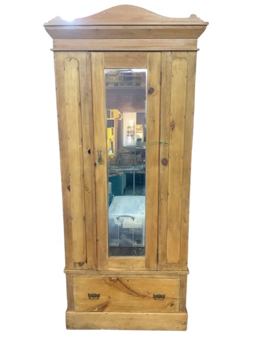An Edwardian pine wardrobe with arched pediment and angled cornice above a rectangular mirrored door flanked by applied arched panels over a brass handled drawer on a plinth. (35.25in x 19in x 80in)