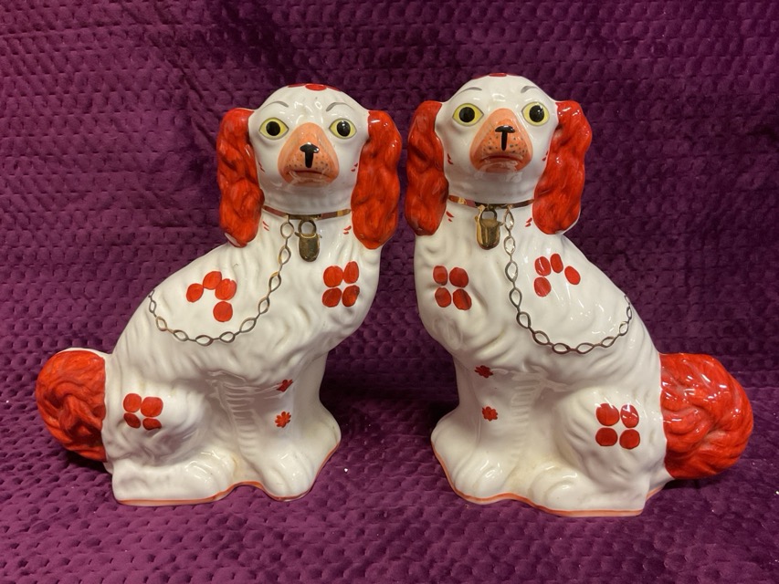 A pair of Staffordshire style handpainted flatback dogs in brick red with gilded collars and yellow eyes by Wood. (11in) (2)