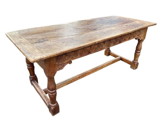 A nineteenth century oak table with cleated plank top above carved friezes, raised on turned legs joined by moulded stretchers. (77.5in x 33.5in x 30.75in)