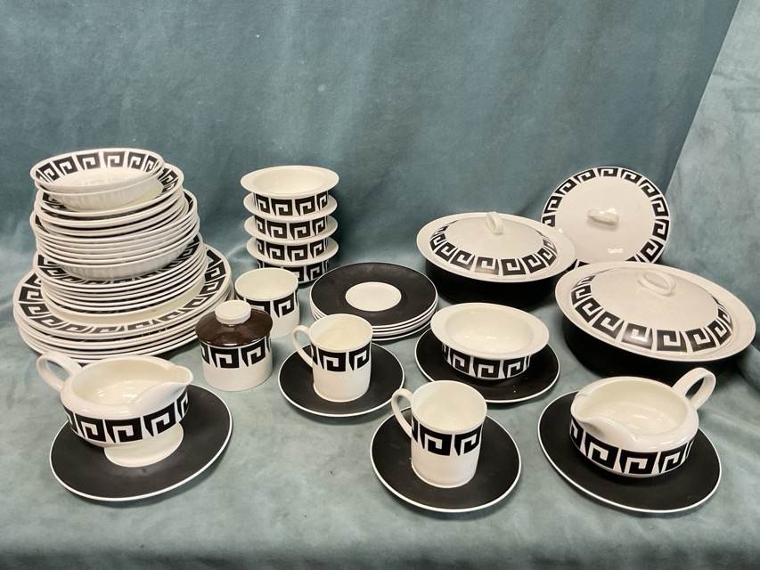 A 70s Susie Cooper black & white breakfast/dinner service decorated in the Keystone patten - turrines & covers, plates, bowls, jugs, cups, etc. (A lot)