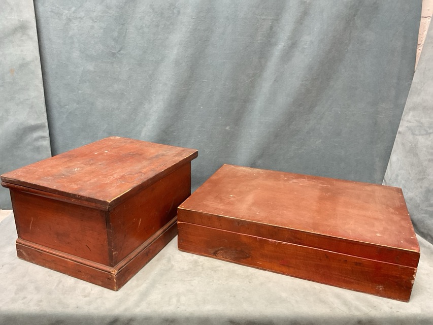 A Victorian dovetailed pine box on moulded plinth; and a rectangular stained box. (2)