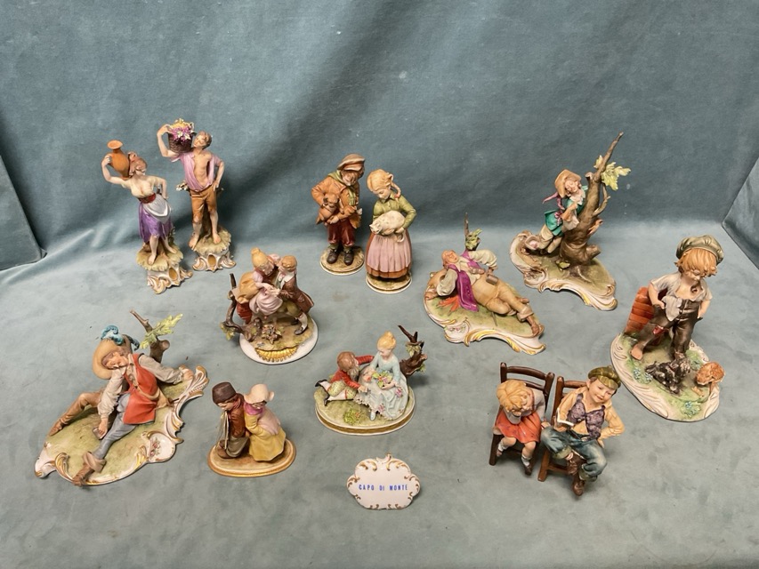 A collection of Capo di Monte figurines - pairs, children, three musketeers on scrolled bases, dancers, etc. (13)