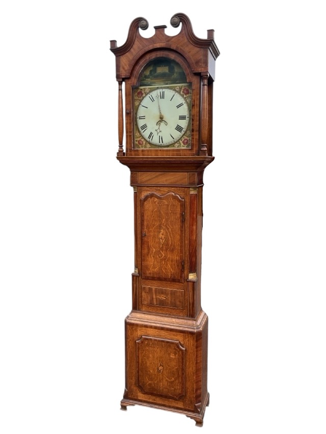 A Victorian oak longcase clock with swan neck pediment to hood above an arched door flanked by columns, enclosing an enamelled convex dial with roman chapters and floral spandrels beneath a country house river landscape, the trunk with crossbanded door framed by quarter columns. (81in)