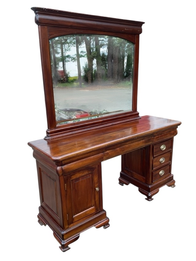 A mahogany dressing table with arched bevelled mirror back above a rectangular top with three cushion moulded frieze drawers, raised on pedestals with drawers & cupboard on bracket feet. (61in x 19in x 72.5in)