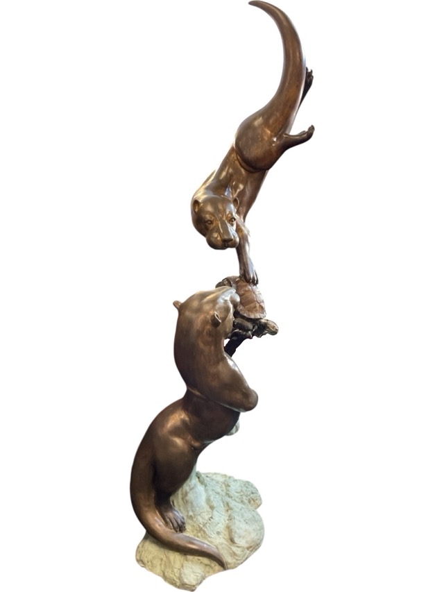 Contemporary 7ft bronze, otters playing with a tortoise on verdigris wave base - signed B. Roge. (83in)