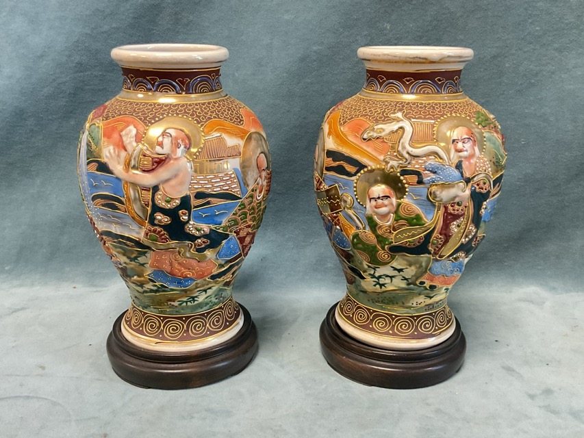 A pair of Japanese Satsuma ovoid vases with relief cast tubelined and handpainted decoration of immortals in a landscape, on turned hardwood stands. (9in) (2)