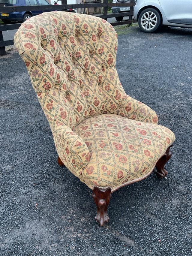 A Victorian upholstered mahogany chair with arched buttoned back above a serpentine fronted seat, raised on carved cabriole legs.