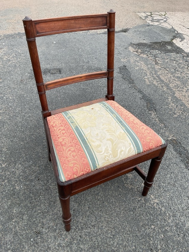 A Georgian mahogany chair with moulded tablet back on turned cylindrical supports above a drop-in upholstered seat, raised on turned tapering legs joined by stretchers.