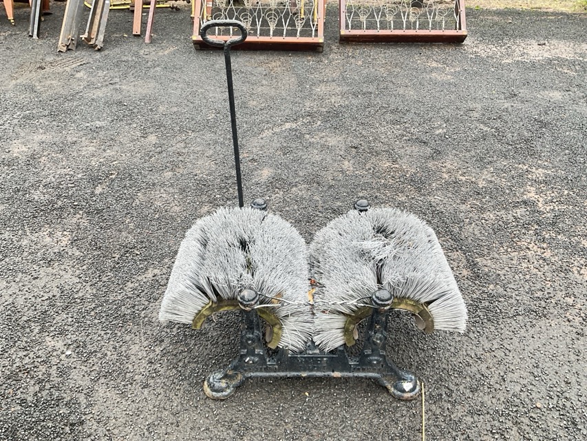 A cast iron bootscraper/ cleaner by Parmiters of Tisbury, with handle above a pair of arched brushes on flowerhead cast frame with ball finials and pad feet. (29in x 17in x 30in)