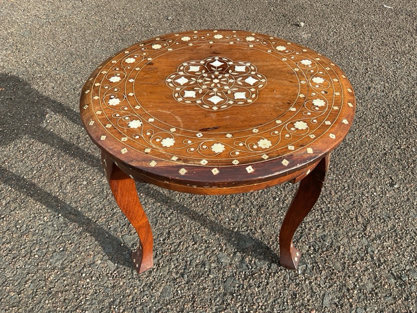 An Indian teak coffee table, the circular top raised on cabriole legs, inlaid allover in bone with a floral and lozenge motifs. (16in x 16in x 17in)